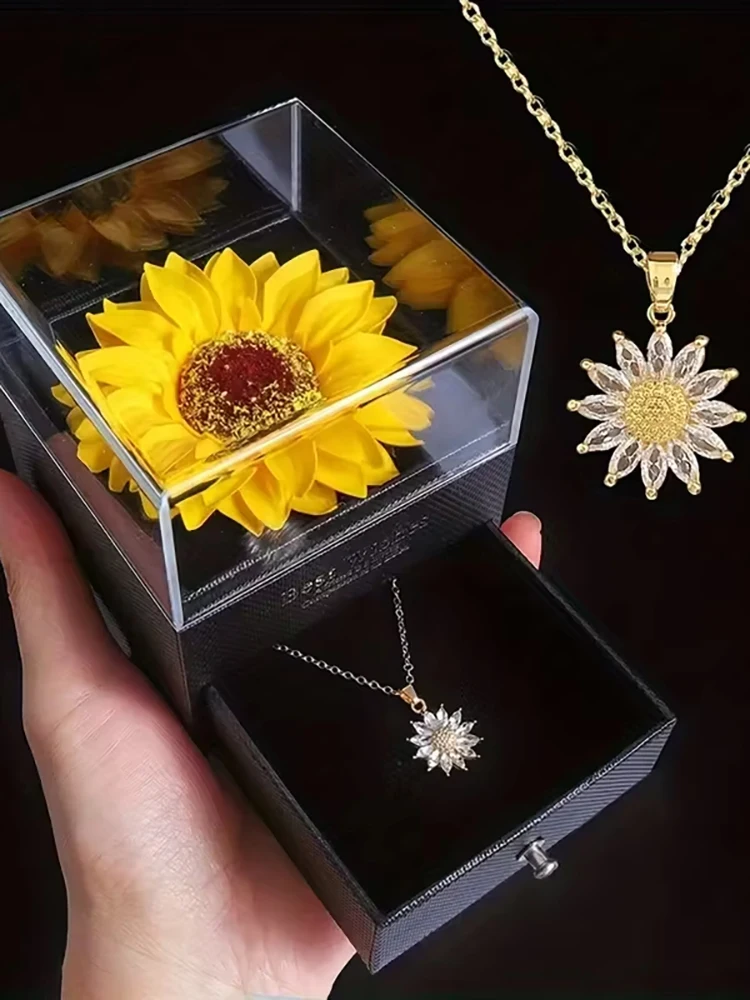 FTCY Sunflower Necklace With Gift Box For Women Dainty Stainless Steel Necklace Elegant Zircon Pendant Birthdays Jewelry Gift